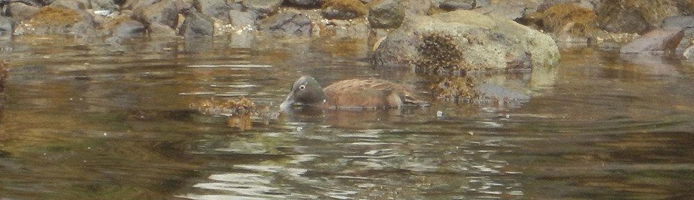9AM The harbor is so calm, barely a ripple. Low, shallow shoreline, dracophyllum and tussock scrub dotted with bright Bulbinella ease right down to the waterline, a thin band of rocks mark the tide. Our zodiacs putter around the shores, looking for teal. A small, flightless duck, the Campbell Island Flightless Teal was thought to have been wiped out by Norway Rats that infested the island from the early sealing days. It was rediscovered by our expedition leader Rodney Russ in 1975 on Dent Is, one of the small, steep islets dotting the coast. The last few birds were captured and a successful breeding program saw them re-introduced in the 1990’s. With the island rat free since 2005 the teal and other wildlife are flourishing.